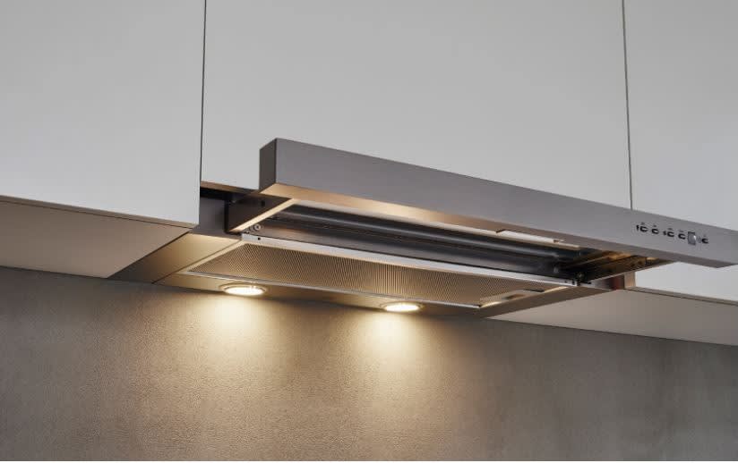 The telescopic extension visor allows for versatile installation options, ensuring a perfect fit in any kitchen space. Whether your cabinets are low or high, this range hood adjusts effortlessly to accommodate your needs.